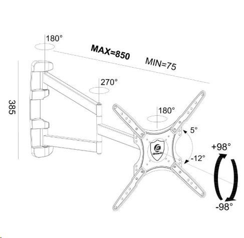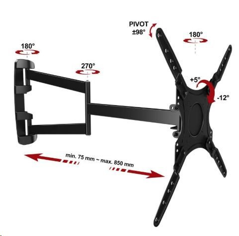 Extra dlhý držiak TV ErgoSolid Longo85 Otáčateľný, sklopný, dĺžkovo nastaviteľný držiak na TV 26-60", funkcia pivot, nosnosť 30kg Najdlhší držiak TV alebo monitora na trhu za dostupnú cenu! Potrebujete otočiť televíziu s uhlopriečkou 60" kolmo ku stene? V tom prípade potrebujete naozaj dlhý držiak s dĺžkou minimálne 75cm. My vám ponúkame držiak s dĺžkou až 85cm za cenu držiakov s dĺžkou 65cm - ErgoSolid Longo85. Tento vynikajúci držiak má unikátnu konštrukciu, ktorá umožňuje dĺžkové nastavenie od 75mm až po 850mm. Vďaka tomu otočíte kolmo ku stene aj televízory s uhlopriečkou 60". Držiak umožňuje aj náklon obrazovky v rozmedzí +5° až -12° a podporuje VESA štandardy 75x75 až 400x400. Zvládne zaťaženie až 30kg aj pri maximálnom vysunutí. Navyše tento držiak má aj funkciu PIVOT - možnosť otočenia obrazovky z horizontálnej do vertikálnej polohy. Najdlhší držiak na televízie a monitory za skvelú cenu - ErgoSolid Longo85 Technické údaje: nosnosť 30kg podpora VESA štandardu 75x75 až 400x400 vhodný na televízie aj monitory s uhlopriečkou 26" až 60" nastaviteľná vzdialenosť od steny v unikátnom rozsahu minimálna vzdialenosť 75mm maximálna vzdialenosť 850mm možnosť náklonu obrazovky v rozsahu +5° až -12° funkcia PIVOT - možnosť otočenia TV z horizontálnej polohy na vertikálnu korekcia roviny obrazovky aj po montáži konštrukcia špičkovej kvality materiál oceľ, výborné spracovanie inštalačný materiál súčasť balenia farebné prevedenie čierne záručná doba 3 roky Najdlhší držiak na televíziu, otočenie televízie kolmo ku stene, funkcia pivot, TOP kvalita - Ergosolid Longo85 Veľmi dlhý držiak na televízor alebo monitor, dĺžka 75mm až 850mm, nosnosť 30kg, na televízie 26 až 60 palcov - ErgoSolid Longo85 Najdlhší držiak TV ErgoSolid Longo85 podporuje VESA štandardy: VESA 75x75 VESA 100x100 VESA 200x100 a 100x200 (pri VESA 100x200 nie je možné využiť funkciu PIVOT) VESA 200x200 VESA 300x300 VESA 400x400