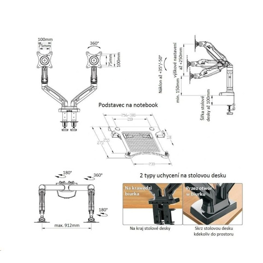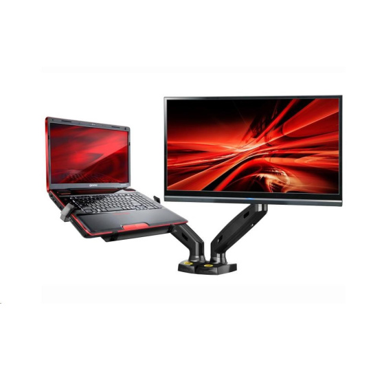 Fiber Mounts H3F160 Držiak na notebook a monitor Súprava držiaka na monitory NB F160 + držiaku na notebook Ergosolid NBH3 za zvýhodnenú cenu, umožňuje umiestniť na držiak monitor 17" - 27" a notebook 10,1" - 17", otáčanie do strán, naklonenie, dĺžkové a výškové polohovanie, nosnosť 2x 9 kg Špičkový stolový držiak do kancelárie, firmy alebo domácnosti na zavesenie monitora a notebooku. Držiak umožňuje kompletnú polohovateľnosť ako monitoru, tak aj notebooku - otáčanie do strán, naklonenie, dĺžkové a výškové nastavenie, korekciu roviny. Ramenné súpravy majú systém na vedenie káblov. Upevnenie je možné na všetky typy stolov alebo dosiek s hrúbkou 10 mm až 100 mm, existujú dva spôsoby upevnenia - na kraj stolovej dosky alebo kamkoľvek do priestoru (ukotvenie skrz stolovú dosku - nutný otvor). Stolový držiak na upevnenie notebooku (laptopu) a monitora Fiber Mounts H3F160 je vynikajúcej kvality, veľmi pekného dizajnu a poskytujeme naň záruku 5 rokov. Stolový držiak na monitor a notebook do kancelárie, pracovne, firmy alebo domácnosti Fiber Mounts H3F160 Technické údaje: možné zaťaženie každého ramena 2kg až 9kg celková nosnosť držiaka 18kg podporuje VESA štandardy 75x75 a 100x100 odporúčaná uhlopriečka monitora 17" až 27" na notebooky a laptopy 10,1" až 17" výškové polohovanie 250mm otočný +180° / -180° naklonenie +35° / -50° funkcia pivot - otáčanie monitora do horizontálnej alebo vertikálnej polohy korekcia roviny monitora aj notebooku vhodný na upevnenie všetkých notebookov a laptopov s šírkou 255-380 mm systém na vedenie káblov výborná kvalita krásny dizajn záruka 5 rokov
