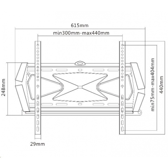 Technické údaje: nosnosť 40kg podpora VESA 300x200 až 400x400 na televízory a monitory s uhlopriečkou 42-55" systém pre uzamknutie TV na držiaku (zámok nie je súčasťou balenia) vzdialenosť od steny 22mm veľmi pevná konštrukcia dizajnové krytky inštalačný materiál, vodováha farebné prevedenie čierne záruka 3 roky Držiak podporuje VESA: VESA300x200 VESA 300x300 VESA 400x200 VESA 400x300 VESA 400x400 v prípade demontáže stredového dizajnového krytu umožníte nastavenie VESA 100x100, VESA 200x100 a VESA 200x200