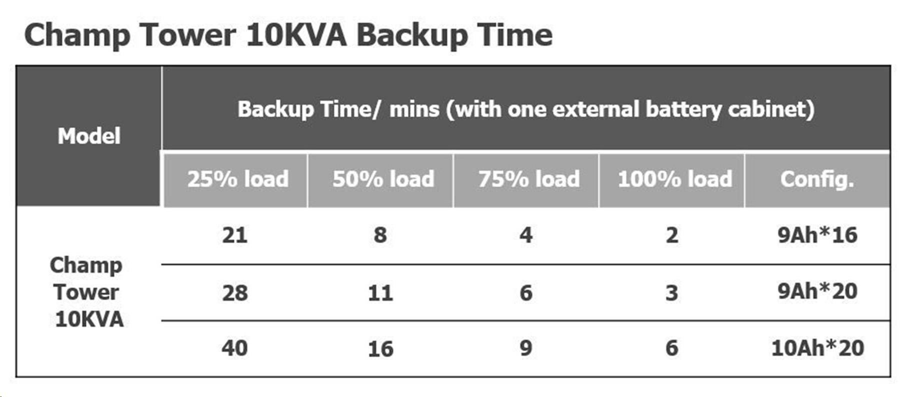 | Záložný čas - 1x batéria (20ks 9Ah) | |