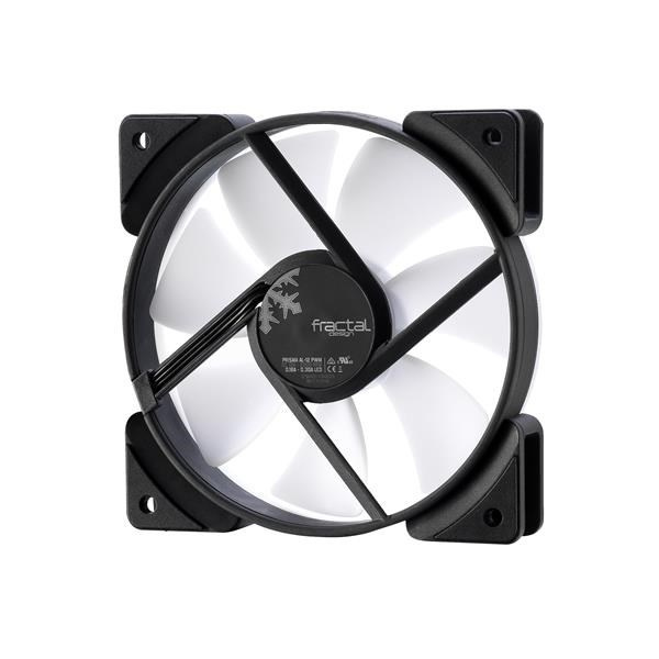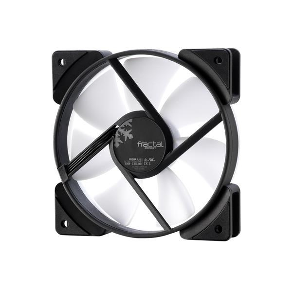 Tichý PC ventilátor Fractal Design Prisma AL-12 ARGB so 6 RGB LED diódami, polopriehľadnými bielymi lopatkami ventilátora a bielym krúžkom vytvára rovnomernú žiaru po celom povrchu ventilátora.