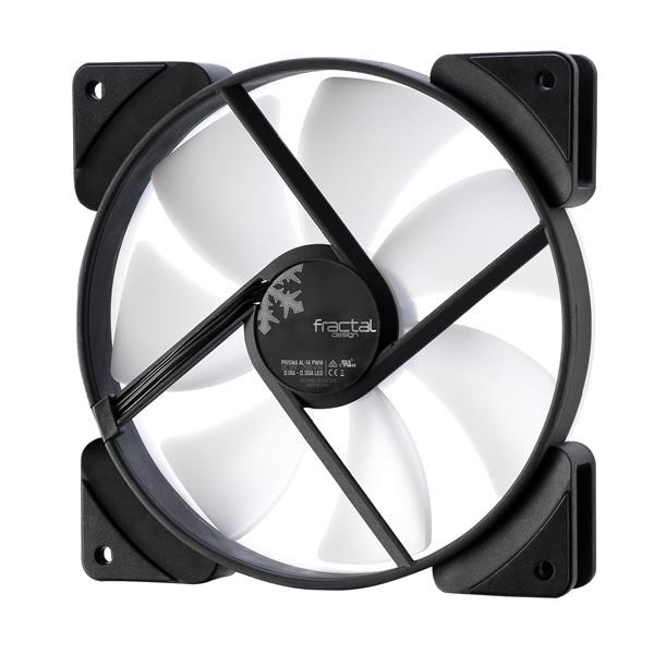 Tichý PC ventilátor Fractal Design Prisma AL-14 ARGB PWM so 6 RGB LED diódami, polopriehľadnými bielymi lopatkami ventilátora a bielym prstencom vytvára rovnomernú žiaru po celom povrchu ventilátora.