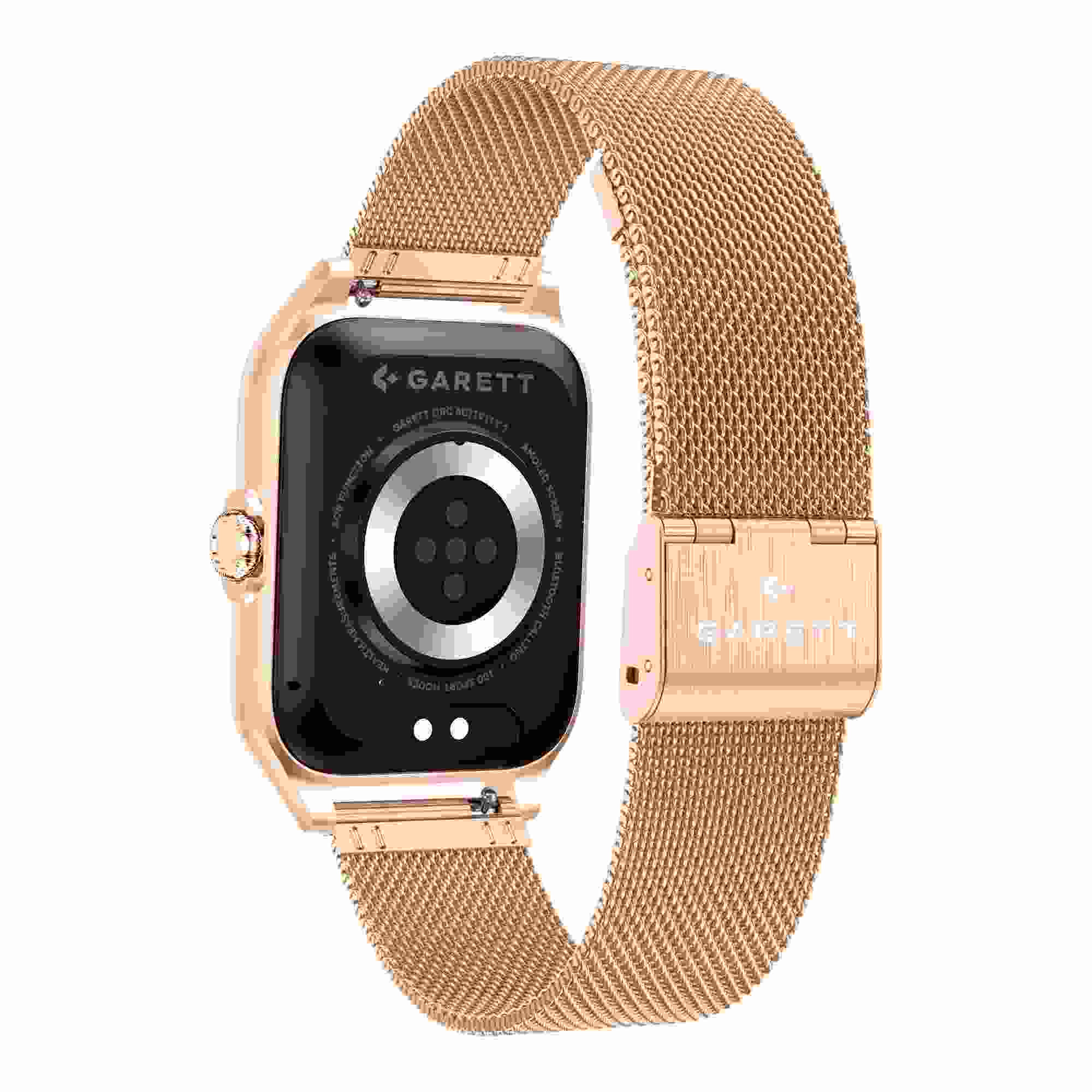 • Balenie obsahuje: chytré hodinky Garett, zlatorůžový silikonový řemínek, zlatý kovový řemínek, nabíjecí kabel USB (bez zástrčky), příručku QSG