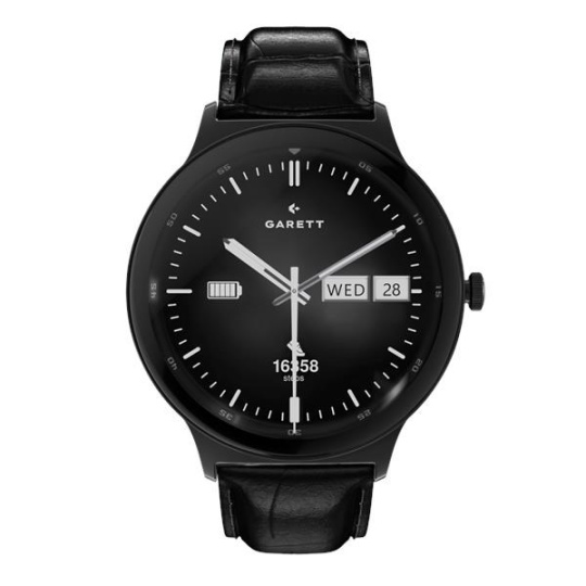• Sada obsahuje: smartwatch GARETT, náhradní kožený řemínek (černý / hnědý dle varianty), nabíjecí základna USB, QSG návod