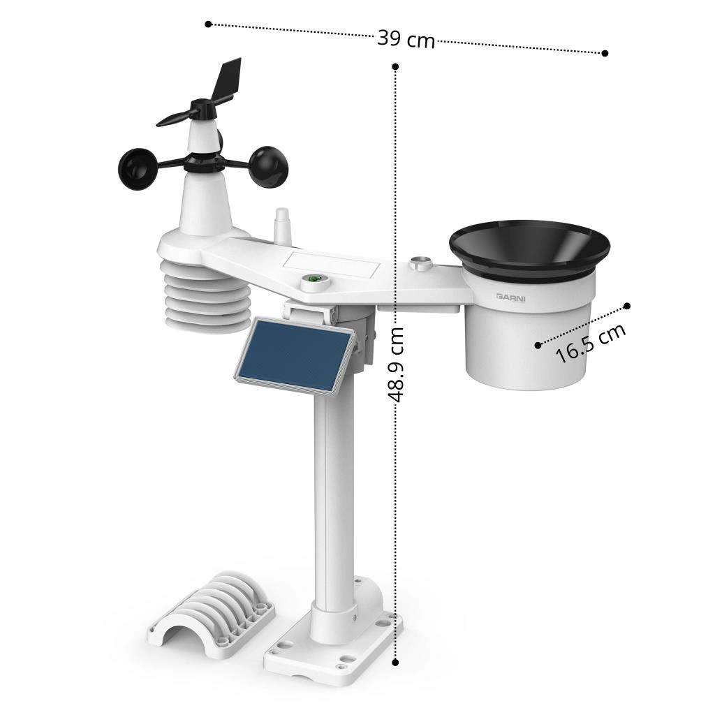 Integrovaný bezdrôtový senzor 7-v-1 GARNI 1NG meria vonkajšiu teplotu a relatívnu vlhkosť, rýchlosť a smer vetra, dažďové zrážky, UV index a slnečné žiarenie, a údaje sú odosielané do hlavnej jednotky až do vzdialenosti 150 m (v otvorenom priestore).
