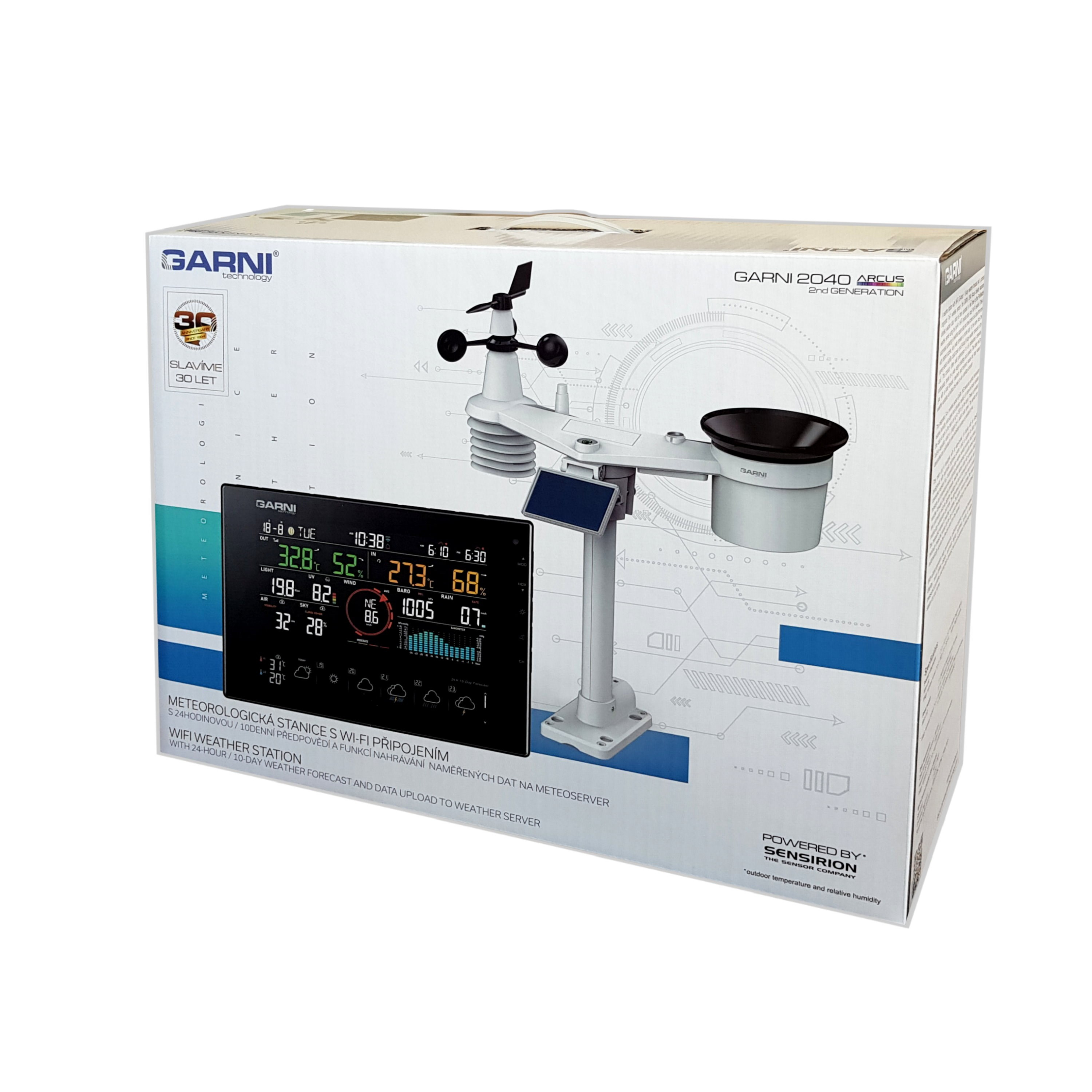 Meteorologická stanica s Wi-Fi, 24-hodinovou (predpoveď po hodine) / 10-dňovou predpoveďou a profesionálnym integrovaným bezdrôtovým čidlom 7-v-1 s solárnym panelom a vstavaným kapacitrom, model GARNI 2040 Arcus 2GEN, zhromažďuje presné a podrobné údaje o počasí, ktoré následne v reálnom čase nahráva pomocou vstavaného modulu Wi-Fi a miestnej Wi-Fi siete na meteorologický server ProWeatherLive. Ten umožňuje automatizované nahrávanie údajov z meteorologickej stanice a voľný prístup ku všetkým údajom odkiaľkoľvek, kde je prístup na internet, a to prostredníctvom webového prehliadača alebo mobilnej aplikácie. Súčasne server PWL odosiela do hlavnej jednotky informácie o dohľadnosti, oblačnosti a 24-hodinovej / 10-dňovej predpovedi počasia. Výrobok ponúka spoľahlivý výkon všetkým profesionálnym pozorovateľom a nadšencom, a to vďaka širokej škále nastavení a čidiel. Stanica vám poskytne miestnu predpoveď, maximálne a minimálne hodnoty a celkové hodnoty všetkých meteorologických veličín, to všetko bez potreby použitia stolného počítača.