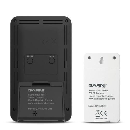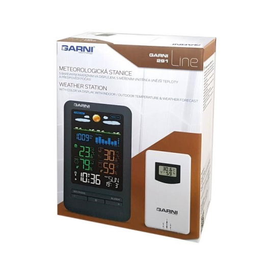 Meteorologická stanica so špičkovým inverzným farebným VA displejom s časom riadeným rádiovým signálom DCF-77, budíkom, meraním vnútorné teploty, relatívnej vlhkosti a absolútneho barometrického tlaku a bezdrôtovým senzorom na meranie vonkajšej teploty a relatívnej vlhkosti inverzný farebný VA displej o veľkosti 64 x 94 mm s možnosťou stályho osvetlenia pri napájaní sieťovým adaptérom, alebo krátkodobým osvetlením na 15 s pri napájaní batériami 4 stupne jasu osvetlenia displeja, možnosť vypnutia osvetlenia displeja s možnosťou krátkodobého osvetlenia na 15 s (pri napájaní sieťovým adaptérom) funkcia automatického ztlmenia osvetlenia displeja v nastavenom časovom intervale veľkosť číslic na displeji – čas 12 mm, dátum 5,5 mm, skratka názvu dňa 6 mm, barometrický tlak 8 mm, vnútorná a vonkajšia teplota a rel. vlhkosť 13 mm čas a dátum riadené signálom DCF-77 s možnosťou manuálneho nastavenia ikona príjmu signálu DCF-77 skratka názvu dňa v češtine, angličtine, nemčine, francúzštine, taliančine, španielčine, portugalčine, holandčine, dánčine, norčine, švédčine, poľštine, fínčine, maďarčine a ruštine 12-hodinový alebo 24-hodinový formát zobrazenia času možnosť nastavenia časového pásma od -12 do +12 hodín 2 budíky, možnosť nastavenia budenia každý deň, v pracovné dni, alebo len cez víkend funkcia opakovania budenia (Snooze) po 5 minútach budící signál – 10 sekúnd 1 pípnutie za sekundu, 10 sekúnd 2 pípnutia za sekundu, 10 sekúnd 3 pípnutia za sekundu a potom stály 4 pípnutia za sekundu 5 ikoniek predpovede počasia (slnečno, čiastočne zamračené, zamračené, zrážky a sneženie) na základe sledovania barometrického tlaku vstavaným barometrickým senzorom zobrazenie hodnôt vnútorné a vonkajšie teploty a relatívnej vlhkosti pamäť na maximálne a minimálne namerané hodnoty teploty a rel. vlhkosti meranie absolútneho barometrického tlaku (hPa / mb alebo inHg) šípky tendencie vývoja absolútneho barometrického tlaku, vnútorné a vonkajšie teploty a rel. vlhkosti stĺpcový graf vývoja barometrického tlaku za posledných 24 hodín. 3 ikonky stavu vnútorné a vonkajšej relatívnej vlhkosti možnosť nastavenia alarmu hornej hranice vonkajšej teploty v rozsahu od -39°C do +70°C a dolnej hranice vonkajšej teploty od -40°C do +69°C (s akustickým signálom a ikonou na displeji) pre každý kanál zvlášť indikácia námrazy ikonou na displeji, ak bude nameraná vonkajšia teplota v rozmedzí od -1°C do +3°C niektorým z prihlásených bezdrôtových senzorov zobrazenie teploty vo °C alebo °F možnosť použitia až 3 bezdrôtových senzorov GARNI 30H (jedno senzor GARNI 030H je súčasťou dodávky) funkcia automatického prepínania kanálov bezdrôtový prenos hodnôt vonkajšej teploty a relatívnej vlhkosti na frekvencii 433,92 MHz ikona príjmu signálu bezdrôtového senzora ikony slabých batérií napájanie sieťovým adaptérom alebo batériami možnosť postavenia farba čierna Bezdrôtový senzor GARNI 030H odolný voči vlhkosti displej o veľkosti 19 x 11 mm veľkosť číslic na displeji: teplota a relatívna vlhkosť 4 mm meranie teploty a relatívnej vlhkosti 3 kanály maximálny RF výkon 10 dBm (10 mW) možnosť postavenia a zavesenia farba biela Obsah balenia: 1 x hlavná jednotka GARNI 291 Line 1 x bezdrôtový senzor GARNI 030H 1 x sieťový adaptér český, slovenský, nemecký, anglický, holandský, poľský a maďarský návod