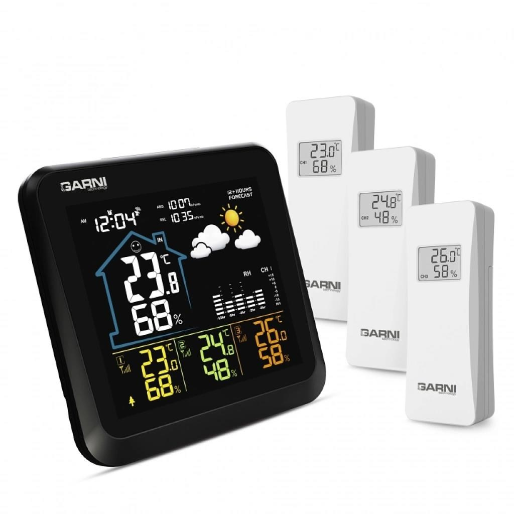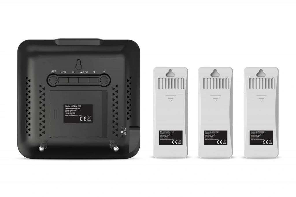 Meteorologická stanica s 3 bezdrôtovými snímačmi na meranie vonkajšej teploty a relatívnej vlhkosti, špičkovým inverzným farebným VA displejom s časom a dátumom riadeným rádiovým signálom DCF-77, budíkom, grafom, meraním vnútornej teploty, relatívnej vlhkosti a absolútneho a relatívneho barometrického tlaku. Zobrazenie všetkých meraných hodnôt na displeji súčasne. špičkový inverzný farebný VA displej o rozmeroch 106 x 94 mm s možnosťou stályho osvetlenia pri napájaní sieťovým adaptér, alebo krátkodobým osvetlením na 10 s pri napájaní batériami tri stupne jasu osvetlenia displeja (pri napájaní sieťovým adaptér) a možnosť vypnutia osvetlenia displeja veľkosť číslic na displeji – čas, dátum 7 mm, vnútorná teplota 21 mm, vnútorná relatívna vlhkosť 14 mm, vonkajšia teplota 12,5 mm, vonkajšia relatívna vlhkosť 10 mm, barometrický tlak 4,5 mm farbenie na displeji: čas, barometrický tlak, vnútorná teplota a rel. vlhkosť, graf biela, teplota a rel. vlhkosť na kanáli č.1 žltá, na kanáli č.2 zelená a na kanáli č.3 oranžová čas a dátum riadené signálom DCF-77 s možnosťou manuálneho nastavenia ikona príjmu signálu DCF-77 12-hodinový alebo 24-hodinový formát zobrazenia času možnosť nastavenia časového pásma od -12 do +12 hodín budík s funkciou opakovaného budenia (Snooze) po 5 minútach budící signál - 10 sekúnd 1 pípnutie za sekundu, 10 sekúnd 2 pípnutia za sekundu, 10 sekúnd 4 pípnutia za sekundu a následne stály pípajúci zvuk 5 ikon predpovede počasia (jasno, polojasno, oblačno, zrážky (dážď), zrážky (sneženie) na základe sledovania barometrického tlaku vestaveným barometrom možnosť nastavenia východiskovej ikony predpovede počasia zobrazenie hodnôt vnútorného a vonkajšieho tepla a relatívnej vlhkosti zo všetkých 3 snímačov súčasne zobrazenie teploty vo °C alebo °F zobrazenie barometrického tlaku absolutného a relatívneho (hPa/mb alebo mmHg) možnosť nastavenia hodnoty relatívneho barometrického tlaku graf vývoja bar. tlaku, vnútorné a vonkajšie teploty na všetkých troch kanáloch za uplynulých 12 hodín pamäť na maximálne a minimálne namerané hodnoty teploty a relatívnej vlhkosti 3 ikony vnútorného tepelného pohodlia 3 bezdrôtové snímače GARNI 052H sú súčasťou balenia bezdrôtový prenos hodnôt vonkajšej teploty a relatívnej vlhkosti na frekvencii 433 MHz ikona slabých batérií hlavnej jednotky a vonkajších snímačov napájanie hlavnej jednotky sieťovým adaptérom alebo batériami dĺžka kábla sieťového adaptéra 1,80 m možnosť postaviť, alebo zavesiť farba čierna Bezdrôtové snímač GARNI 052H odolné voči vlhkosti displej o rozmeroch 25 x 12 mm veľkosť číslic na displeji: teplota 7 mm a relatívna vlhkosť 6 mm meranie teploty a relatívnej vlhkosti 3 kanály maximálny RF výkon 10 dBm (10 mW) možnosť postaviť, alebo zavesiť farba biela Obsah balenia: 1 x hlavná jednotka GARNI 502 3 x bezdrôtové snímače GARNI 052H 1 x sieťový adaptér český, slovenský, nemecký, anglický, poľský, maďarský a holandský návod