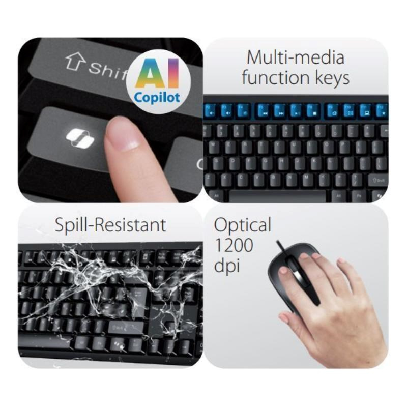 Vysoko kvalitný set klávesnice a myši pokryje všetky vaše základné kancelárske potreby. Klávesnica disponuje klávesom na vyvolanie AI asistenta Microsoft Copilot v systéme Windows a radom programovateľných funkčných klávesov, ktoré je možné využiť na jednoduchšie ovládanie hudobného prehrávača, sociálnych sietí alebo kancelárskych programov. Klávesnica je odolná voči poliatiu, takže zostane funkčná aj pri neočakávanej nehode. Myš je vybavená optickým senzorom s rozlíšením snímača 1200 DPI, čo zabezpečí plynulé a presné ovládanie.