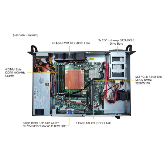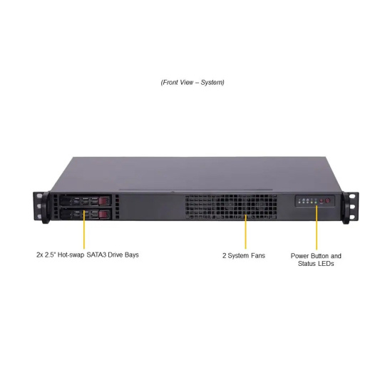 SYS-111AD-HN2-02-G1 CPU: Core i7-12700E Pamäť: 1x 32GB DDR5-4800 Úložisko: 1x 1.9TB 2,5" SATA Sieť: 2x 1G RJ45 1U krátka hĺbka predochondia I/O, 2 hot-swap 2,5" SATA disky, 1x PCIe 5.0 x16 (HHHL)