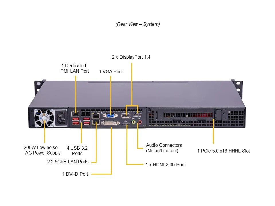 SYS-111AD-HN2-02-G1 CPU: Core i7-12700E Pamäť: 1x 32GB DDR5-4800 Úložisko: 1x 1.9TB 2,5" SATA Sieť: 2x 1G RJ45 1U krátka hĺbka predochondia I/O, 2 hot-swap 2,5" SATA disky, 1x PCIe 5.0 x16 (HHHL)