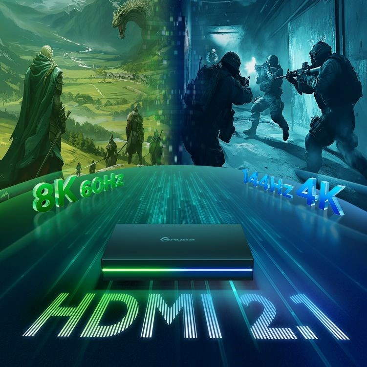 Govee AI Sync Box Kit 2 je vybavený HDMI 2.1, čo umožňuje podporu pokročilých funkcií, ako sú Dolby Vision, ARR a ALLM. Vďaka tejto technológii môžete očakávať špičkovú kvalitu obrazu s bohatými farbami a vyššiu dynamiku, ideálne pre moderné domáce kino a herné zostavy. HDMI 2.1 zabezpečuje optimálnu kompatibilitu s najnovšími štandardmi, čo znamená plynulé prepínanie režimov a minimálne oneskorenie pre dokonale synchronizovaný vizuálny zážitok.