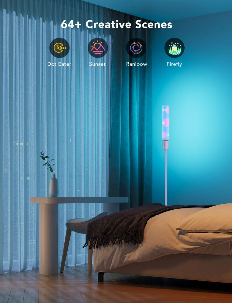 Govee Floor Lamp ponúka milióny farieb a 64 prednastavených scénových režimov v aplikácii Govee Home. Preskúmajte DIY režim a vytvorte si paletu priamo pre vás a váš interiér. Vďaka aplikácii môžete scény automatizovať a nastaviť aj časový rozvrh.