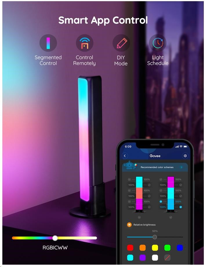 Jednoducho spravujte nastavenia farieb a intenzity svetla pomocou aplikácie Govee Home. Aplikácia je zadarmo na stiahnutie v Google Play a AppStore. Navyše získate prístup k funkcii časovača, farbám pre domácich majstrov, režimu videa, synchronizácii hudby a režimom scény. Svetlo je možné ovládať aj priamo na dodávanej ovládacej skrinke.