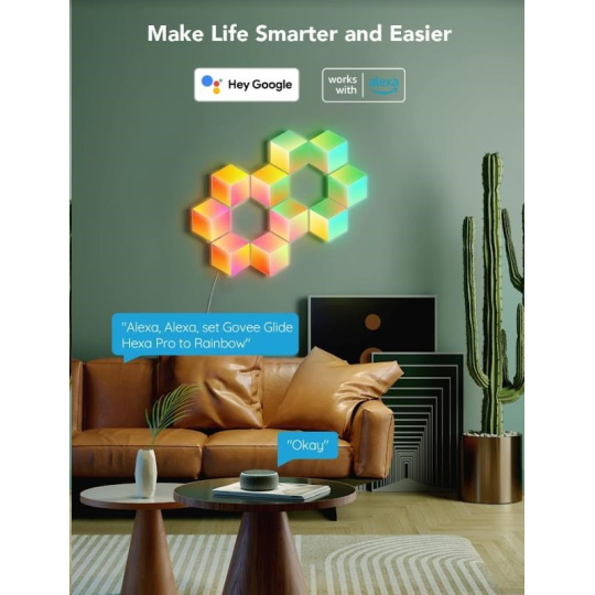 Govee Hexa Pro ponúka 38 rôznych režimov pre dokonalé naladenie svetelnej atmosféry. Govee technológia RGBIC dokáže zobraziť až 57 farieb naraz z celkového rozsahu 16 miliónov farieb pri intenzite 1-100%. Môže sa tiež pochváliť životnosťou až 50.000 hodín.