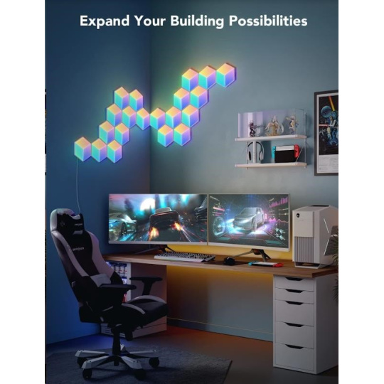 Vylepšite interiér a herné, filmové a hudobné zážitky s dizajnovým svetlom Hexa PRO 3D Smart LED. Vďaka technológii RGBIC zobrazuje až 57 farieb naraz. Farby si môžete nastaviť po jednotlivých sekciách a kreatívne si pohrať s 3D efektom osvetlenia. Celkovo dokáže zobraziť až 16 miliónov farieb s intenzitou 1-100%. Určite si vyberiete z mnohých režimov osvetlenia a pri počúvaní obľúbenej hudby si môžete zvoliť aj zo 6 rytmických režimov. Svetlá sa ovládajú hlasovo cez Siri, Amazon Alexa alebo Google Assistant alebo prostredníctvom aplikácie Govee Home na chytrom telefóne alebo tablete. Svetlo je určené na inštaláciu na stenu a jeho tvar si môžete prispôsobiť podľa vlastnej fantázie. Jednoduchá inštalácia bez vŕtania s životnosťou až 50.000 hodín.