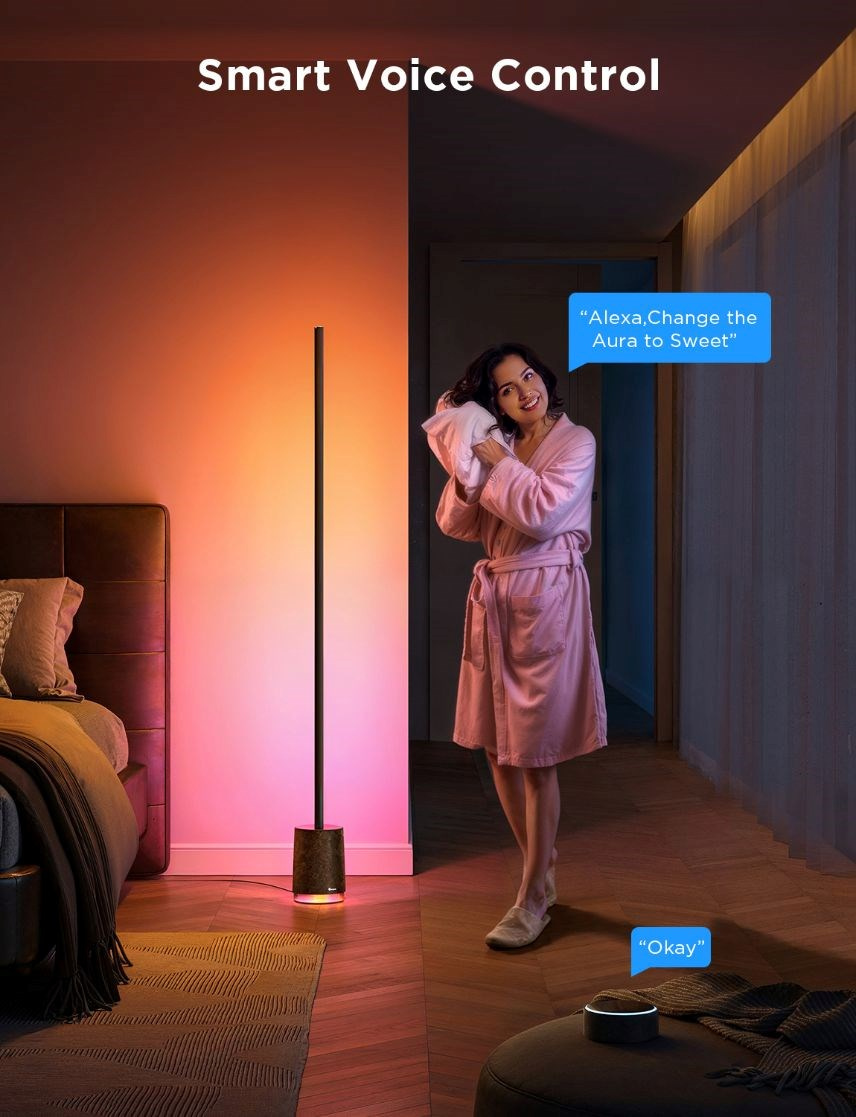 Govee Floor Lamp Pro vychádza z modelu Lyra. Je to minimalistická, moderná stojacia lampa s BT reproduktorom, ktorá prináša dokonalú podívanú a dokonalý zvukový zážitok. Lampa ponúka veľmi slušný výkon 2100 lúmenov. Vďaka 324 LED diódam s technológiou 4 v 1 RGBICWW, ktoré možno rozdeliť až do 54 nezávisle programovateľných segmentov, dokáže lampa poskytnúť veľkolepé predstavenie, ako sú dokonalé farebné gradienty, komplexné farebné vizuály a skvelý jas a kontrast. Dosahuje svetlo ohromujúcej intenzity. K dispozícii je viac ako 16 miliónov farieb alebo biela laditeľná od 2200 do 6500 K. Podlahová lampa Pro je vybavená aj BT reproduktorom, takže k nej môžete pripojiť telefón alebo televízor a používať ju na prehrávanie hudby alebo filmov. Okrem toho sa lampa dodáva s 29 predvoľbami bieleho šumu, ktoré vám pomôžu sústrediť sa, relaxovať alebo zaspať. Vďaka funkcii DreamView môžete lampu synchronizovať s ďalšími svietidlami Govee a jedným dotykom vytvoriť atmosféru na akúkoľvek príležitosť. Lampa meria 172 cm, ale zaberá minimum miesta, takže ju môžete umiestniť doslova kdekoľvek. Najviac sa však bude cítiť v rohu alebo pri stene, kde maximálne osvetlí priestor za sebou a vyčarí na stenách úžasne plynulé farebné gradienty. Životnosť lampy Govee je štandardných 25 000 hodín. Možno ju ovládať pomocou aplikácie Govee Home, Google Home, Google Assistant, Apple a Amazon. Pre maximálne pohodlie nájdete v balení aj klasický diaľkový ovládač, ktorý je vždy pripravený, pripnutý priamo na lampe. Samozrejmosťou sú prednastavené scény, ktorých je 81, niekoľko režimov synchronizácie s hudbou, a ak si ani to nevyberiete, čaká na vás režim DIY, ktorý vám poskytne 100% kontrolu, kde jediným obmedzením je vaša fantázia.