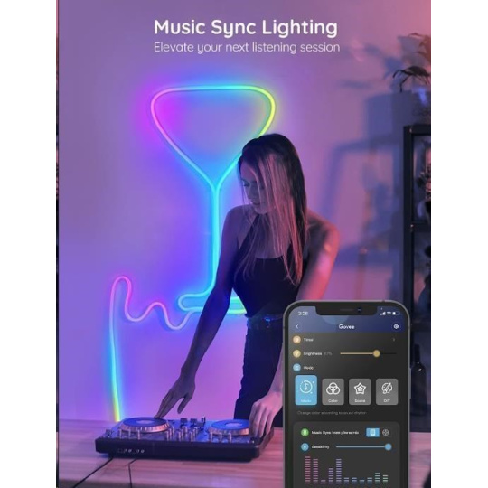 Zlepšite svoje herné, filmové a hudobné zážitky s dizajnovým tvarovateľným svetlom Govee Neon Smart. Je energeticky úsporné s životnosťou až 50.000 hodín. Vďaka technológii RGBIC zobrazuje Govee Neon až 57 farieb naraz a celkovo vie zobraziť až 16 miliónov farieb s intenzitou od 1-100%. Určite si vyberiete z viac ako 64 režimov osvetlenia a pri počúvaní obľúbenej hudby si môžete zvoliť aj z 11 rytmických režimov. Svetlá sa ovládajú hlasom cez Siri, Amazon Alexa alebo Google Assistant alebo cez aplikáciu Govee Home na smartfóne alebo tablete. Svetlo má celkovú dĺžku 2 metre, je určené na inštaláciu na stenu a jeho tvar si môžete prispôsobiť podľa vlastnej fantázie. Jednoduchá inštalácia bez vŕtania pomocou 3M pásky.