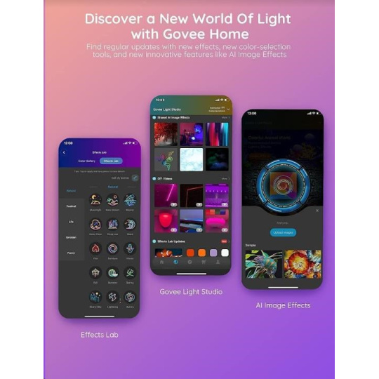 Spravujte nastavenia farieb a intenzity svetla jednoducho pomocou aplikácie Govee Home. Aplikácia je zadarmo na stiahnutie v Google Play a AppStore. Navyše získate prístup k funkcii časovača, DIY farbám, režimu videa, synchronizácii hudby a scénickým režimom. Môžete si tiež pomocou časovača nastaviť automatické vypínanie a zapínanie, napríklad podľa doby zaspávania a vstávania. Ovládanie hlasom je možné cez Siri, Amazon Alexa a Google Assistant.