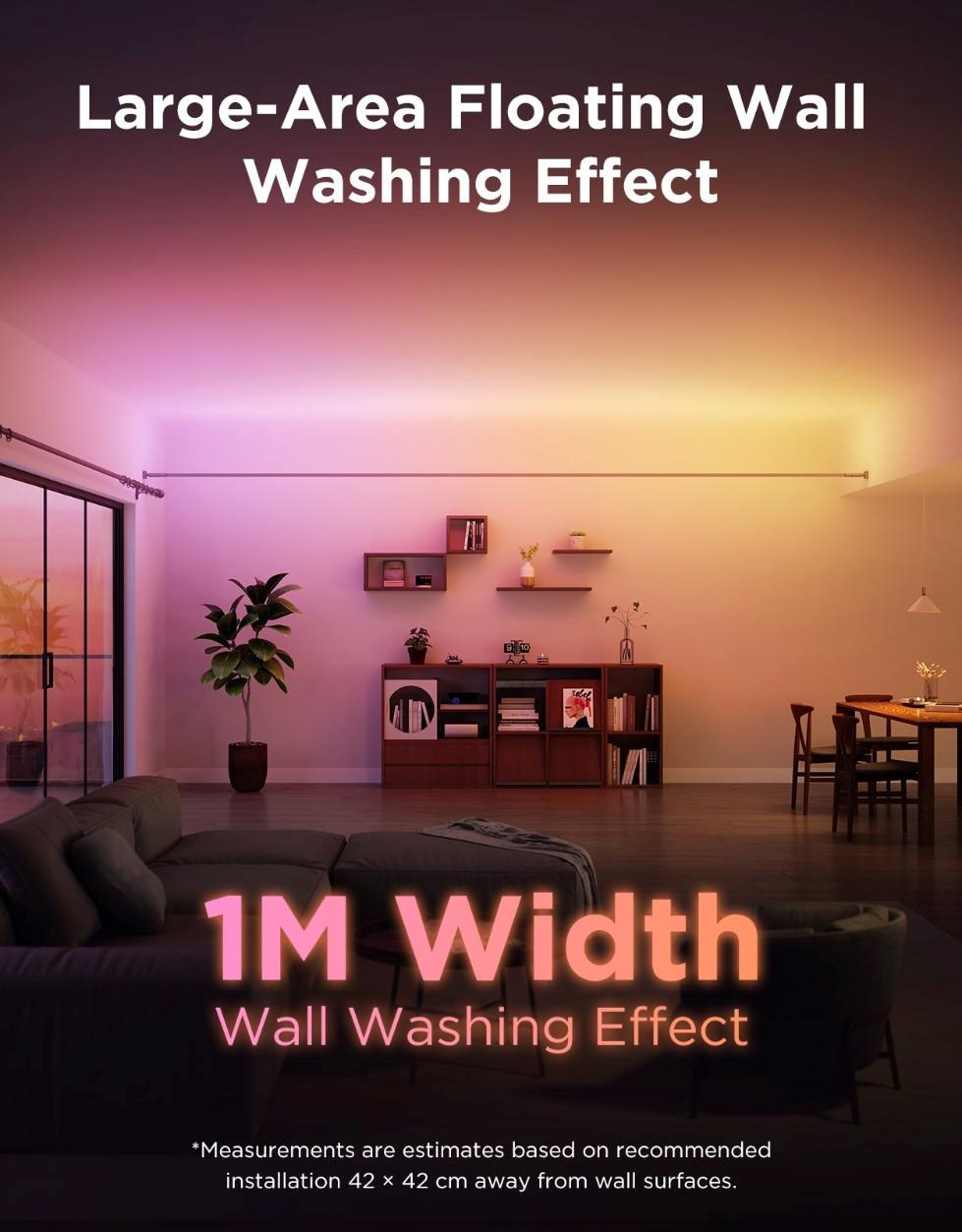 Vďaka svojej zavesenej inštalácii vytvára Govee Strip Light jedinečný „plávajúci“ efekt, ktorý rovnomerne osvetľuje steny záplavou farieb. Pokročilá technológia RGBICWW LED spolu so systémom LuminBlend™ zaisťuje plynulé prechody a ohromujúci vizuálny zážitok. Výsledkom je veľkoplošné osvetlenie, ktoré okamžite premení každú miestnosť na moderný a dynamický priestor.