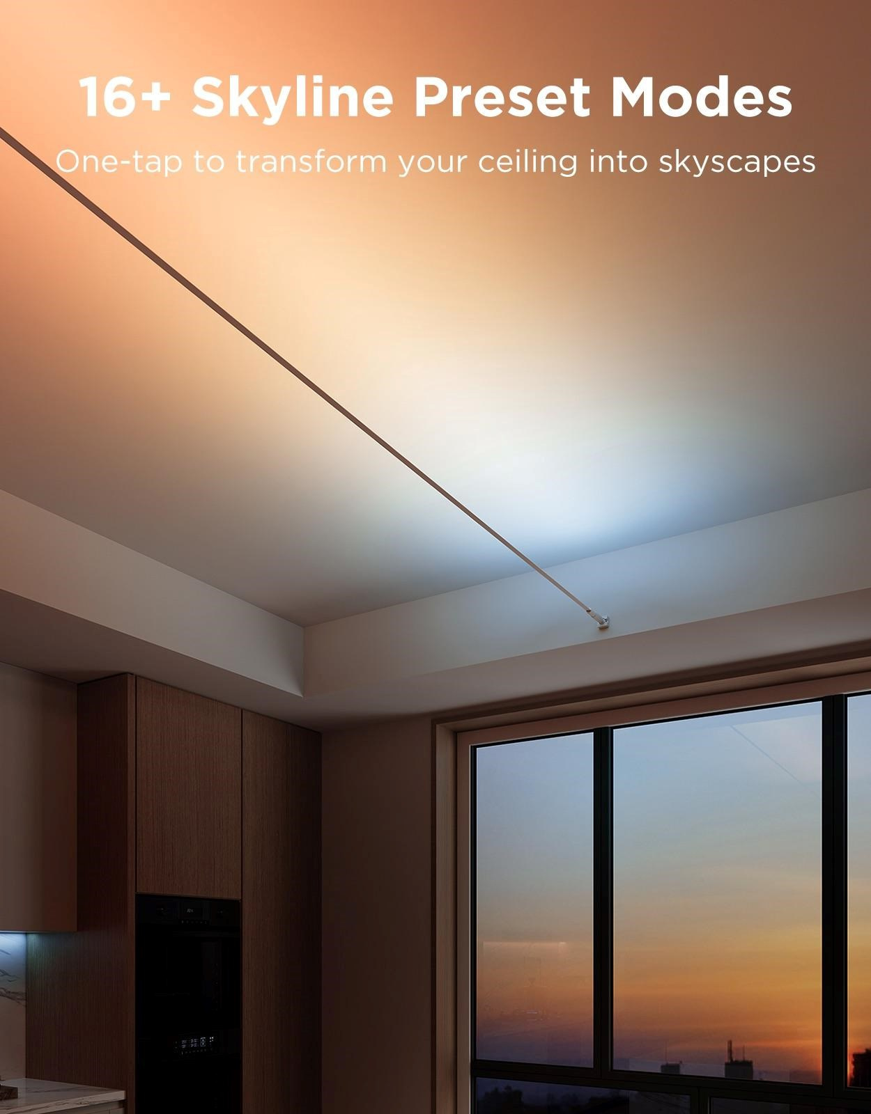 Govee Strip Light obsahuje 16 špeciálnych predvolieb Skyline, ktoré boli navrhnuté špeciálne pre zavesenú inštaláciu s efektom „wall-washing“. Každá z nich vytvára jedinečné farebné prechody a svetelné efekty, ktoré pôsobivo zvýrazňujú priestor. S týmito efektmi môžete dosiahnuť profesionálne osvetlenie bez zložitých nastavení.