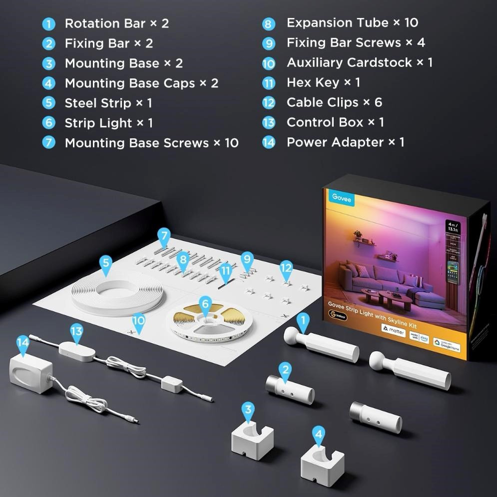 Objavte novú dimenziu inteligentného osvetlenia so súpravou Govee Skyline. Tento 4-metrový závesný LED pásikvytvára na stenách pôsobivý efekt plávajúceho osvetlenia a dokáže premeniť akýkoľvek interiér na moderné a dynamické prostredie. Vďaka najmodernejšej osvetľovacej technológii si môžete vychutnať dokonale plynulé prechody a fascinujúce farebné kombinácie.