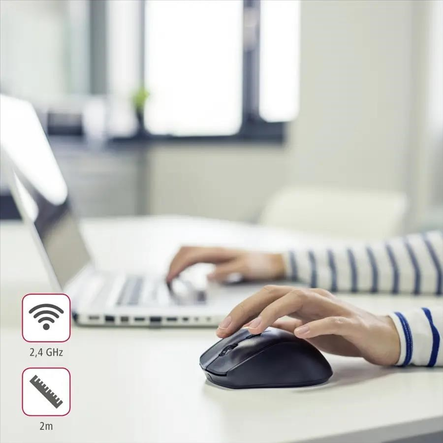 - robustná optická bezdrôtová myš špeciálne pre ľavákov - tlačidlá vpred/späť pre ovládanie internetového prehliadača - tlačidlo on/off pre dlhšiu životnosť batérií - nastaviteľné rozlíšenie (max. 1600 dpi) pre prispôsobenie rýchlosti myši - miniatúrny USB prijímač je možné pohodlne prenášať v tele myši alebo trvale zapojený v notebooku - 2,4 GHz bezdrôtová technológia pre spoľahlivý, rýchly a nerušený prenos signálu s dosahom do 8 metrov Systémové požiadavky: - operačný systém: Windows 10/8/7/Vista Technické parametre: - pripojenie: USB-A zásuvka - počet tlačidiel: 5 (vrátane rolovacieho kolieska) - rozmery: 7,4 x 10,9 x 3,9 cm - rozlíšenie: 800/1200/1600 dpi Obsah balenia: - bezdrôtová myš - USB prijímač - 2 AAA batérie - návod na použitie.
