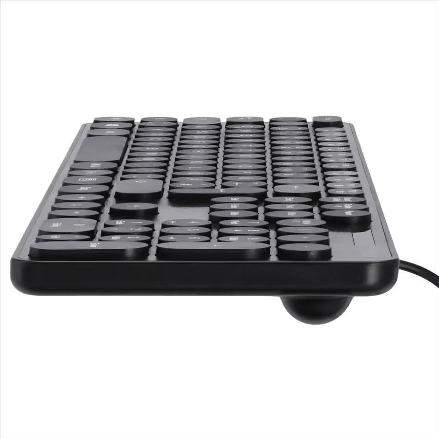 - moderná multimediálna klávesnica s okrúhlymi klávesmi v štýle písacieho stroja pre zadávanie údajov do PC alebo notebooku - tlmené tlačidlá umožňujú tichú a nerušenú prácu - laserom vypálené znaky s vysokou trvanlivosťou - mediálne funkcie (pomocou klávesu FN) - plnoformátové klávesové pole pre intuitívne zadávanie - nie je potrebný žiadny softvér, jednoducho pripojíte a používate - USB pripojenie - CZ/SK layout Systémové požiadavky: - operačný systém: Windows 10/8/7/Vista Technické parametre: - pripojenie: USB A vidlica - počet kláves: 105 - rozmery: 43,8 x 12 x 2,6 cm - dĺžka kábla: 180 cm - hmotnosť: 558 g - farba: čierna.
