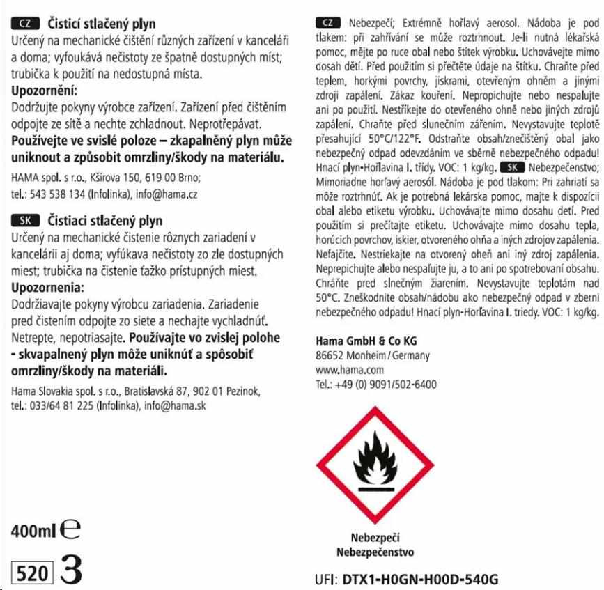 - stlačený vzduch na čistenie rôznych zariadení v kancelárii a v domácnosti - Vyfúka nečistoty z ťažko prístupných miest - Hadica na použitie v ťažko prístupných miestach - Objem: 400 ml Upozornenie pre spotrebiteľov: Pred čistením si prečítajte informácie v návode na použitie. Odpojte zariadenie od napájania a nechajte ho vychladnúť. Čistiacim vzduchom netraste a používajte ho len vo zvislej polohe, inak by mohol kvapalný plyn uniknúť a spôsobiť námrazu na zariadení alebo ho poškodiť. Prázdny obal zlikvidujte v súlade s príslušnými predpismi...