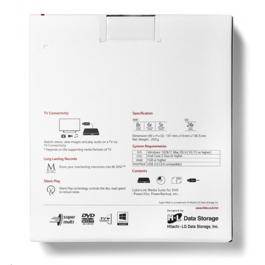 HITACHI LG - externá mechanika DVD-W/CD-RW/DVD±R/±RW/RAM GP57EW40, Slim, biela, krabica+SW