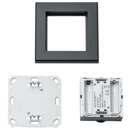 Napájanie zabezpečujú dve tužkové batérie typu AAA s výdržou až 2 roky. Termostat je možné integrovať do Stojánku batériových komponentov 55 mm (HmIP-DS55) alebo prevádzkovať aj bez batérií v kombinácii s Napájacím zdrojom batériových komponentov 55 mm (HmIP-BPS-2) pre zapustenú montáž.