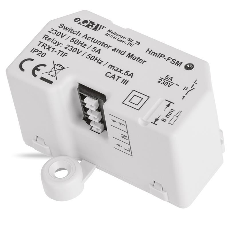 Programovateľný bezdrôtový Spínací akčný člen s meraním (HmIP-FSM) pre skrytú montáž, napájaný zo siete 230 V, je súčasťou systému inteligentnej domácnosti Homematic IP.