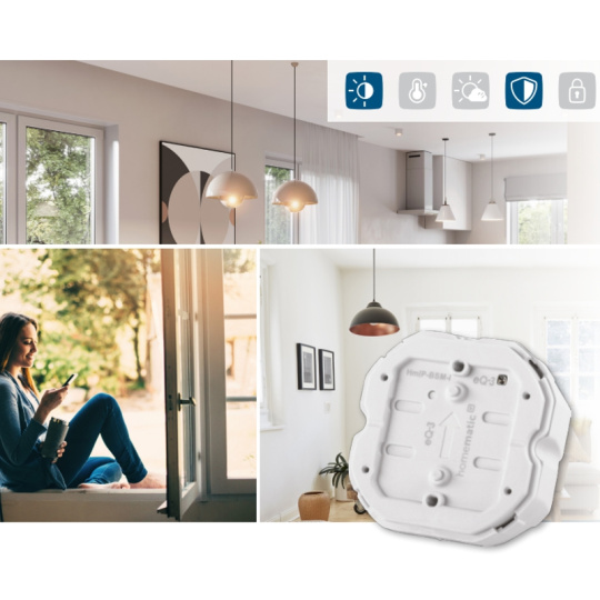 Programovateľný bezdrôtový Spínací akčný člen s meraním (HmIP-BSM-I) pre zápustnú montáž, napájaný zo siete 230 V, je súčasťou systému chytrej domácnosti Homematic IP.