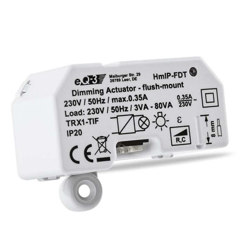 Programovateľný bezdrôtový Stmievací akčný člen (HmIP-FDT) pre skrytú montáž, napájaný zo siete 230 V, je súčasťou systému inteligentnej domácnosti Homematic IP.