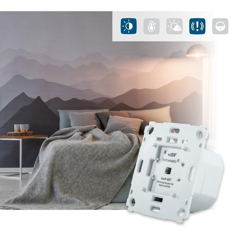 Programovateľný bezdrôtový Stmievací akčný člen (HmIP-BDT) pre zápustnú montáž, napájaný zo siete 230 V, je súčasťou systému inteligentnej domácnosti Homematic IP.