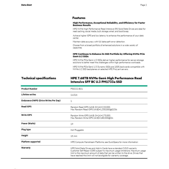 HPE 7.68TB NVMe Gen4 High Performance Read Intensive SFF BC U.3 PM1733a SSD P50222-B21 RENEW.