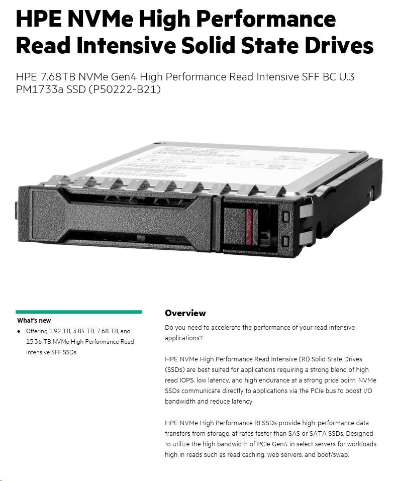 HPE 7.68TB NVMe Gen4 High Performance Read Intensive SFF BC U.3 PM1733a SSD P50222-B21 RENEW.
