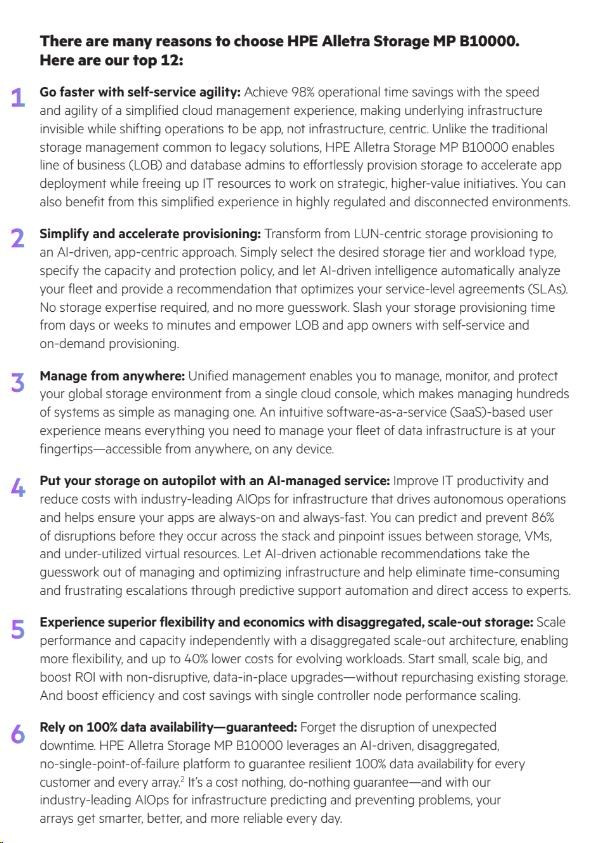 Žádné kompletní výměny: Díky programu HPE Timeless Storage pro HPE Alletra Storage MP B10000 můžete chránit své investice a udržovat úložiště neustále aktuální pomocí aktualizace řadiče bez přerušení provozu. Tím se sníží vaše celkové náklady na vlastnictví a ušetříte v průměru 30 % oproti tradičním kompletním výměnám. Neustále se zlepšující datové služby: Využijte plný potenciál HPE Alletra Storage MP B10000 s naším komplexním předplatným softwaru. Získejte přístup ke všem funkcím a vylepšením našeho operačního systému, včetně cloudových operací řízených umělou inteligencí v cloudu HPE GreenLake, bez dalších nákladů. Spolehněte se na 100% dostupnost dat – zaručeno: Zapomeňte na přerušení provozu způsobená neočekávanými výpadky. HPE Alletra Storage MP B10000 je platforma řízená umělou inteligencí, rozdělená a bez jediného bodu selhání, která zaručuje odolnou 100% dostupnost dat pro každého zákazníka a každé pole. Ukládejte více za méně s HPE StoreMore Guarantee: To zaručuje celkovou úsporu minimálně 4:1 pro vaše pracovní zatížení – snížení nákladů na fyzické úložiště, úsporu energie a zmenšení stopy datového centra. 30denní záruka spokojenosti: Vyzkoušejte HPE Alletra Storage MP B10000 po dobu 30 dnů bez rizika. Pokud nebudete zcela spokojeni s výhodami a schopnostmi vašeho úložného systému, jak jsou popsány v produktových specifikacích, budeme s vámi spolupracovat na nápravě.
