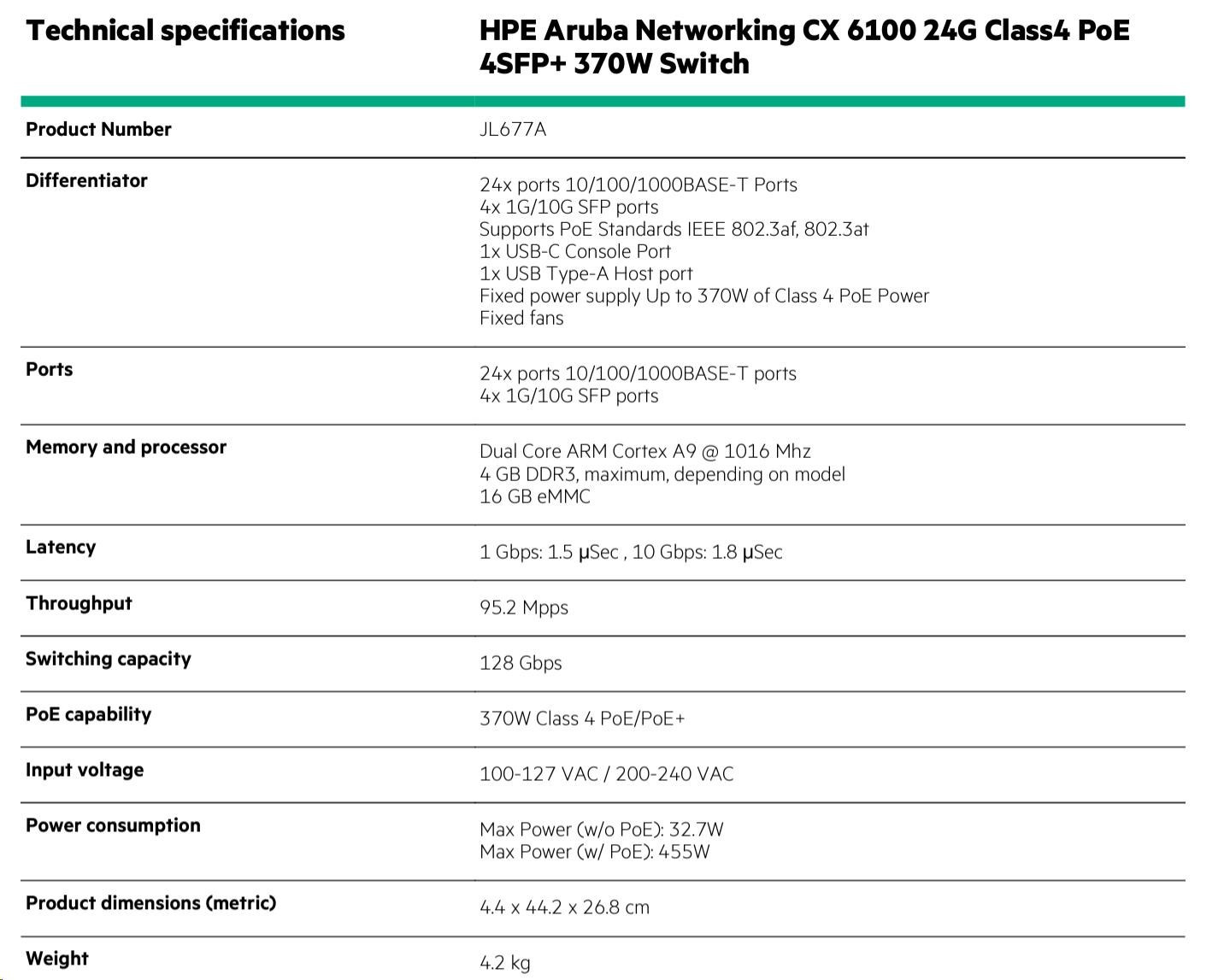 HPE Aruba Networking CX 6100 24G Class4 PoE4SFP+ 370W Switch