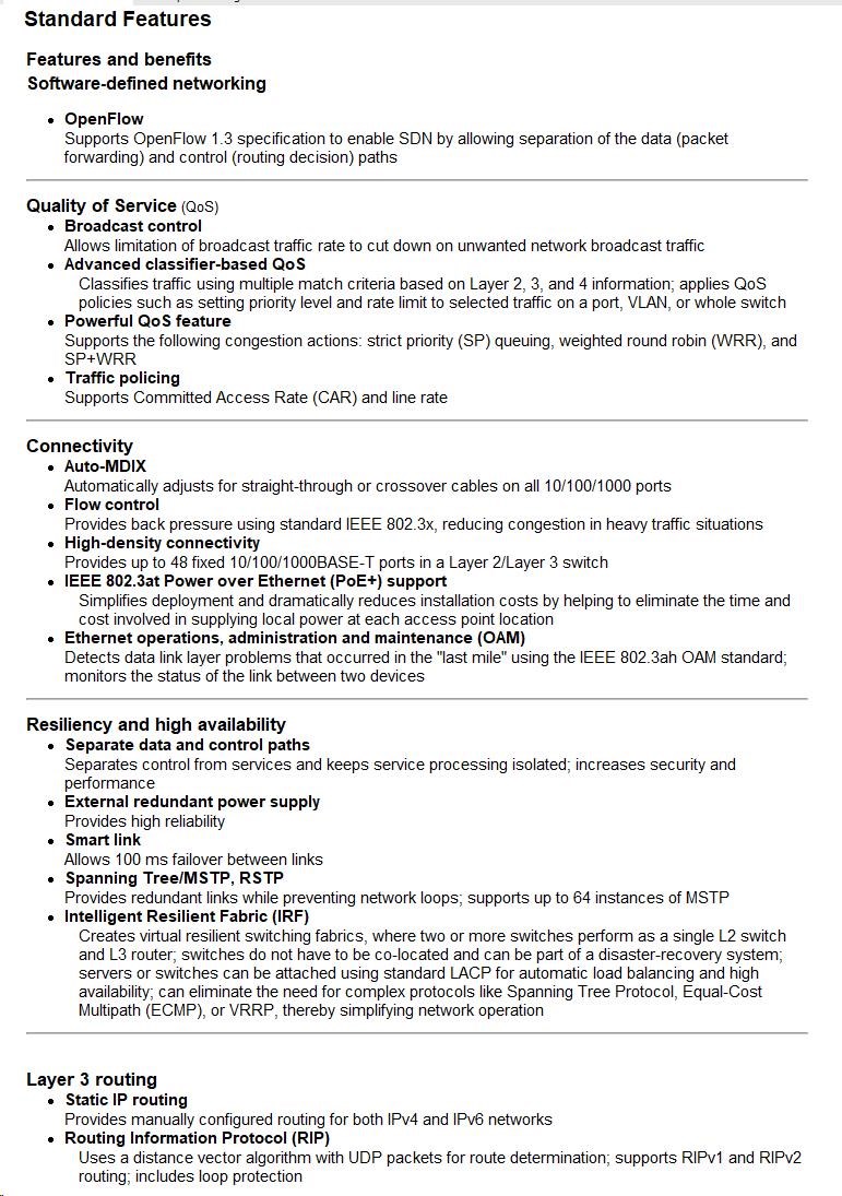 Unique Intelligent Resilient Fabric (IRF) technology creates a virtual fabric by managing several switches as one logical device, which increases network resilience, performance, and availability, while reducing operational complexity. These switches provide Gigabit Ethernet access and can be used at the edge of a network or to connect server clusters in small data centers.