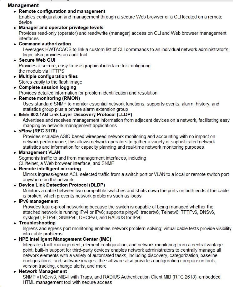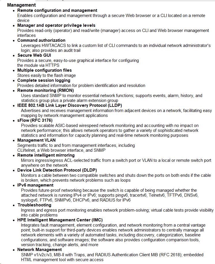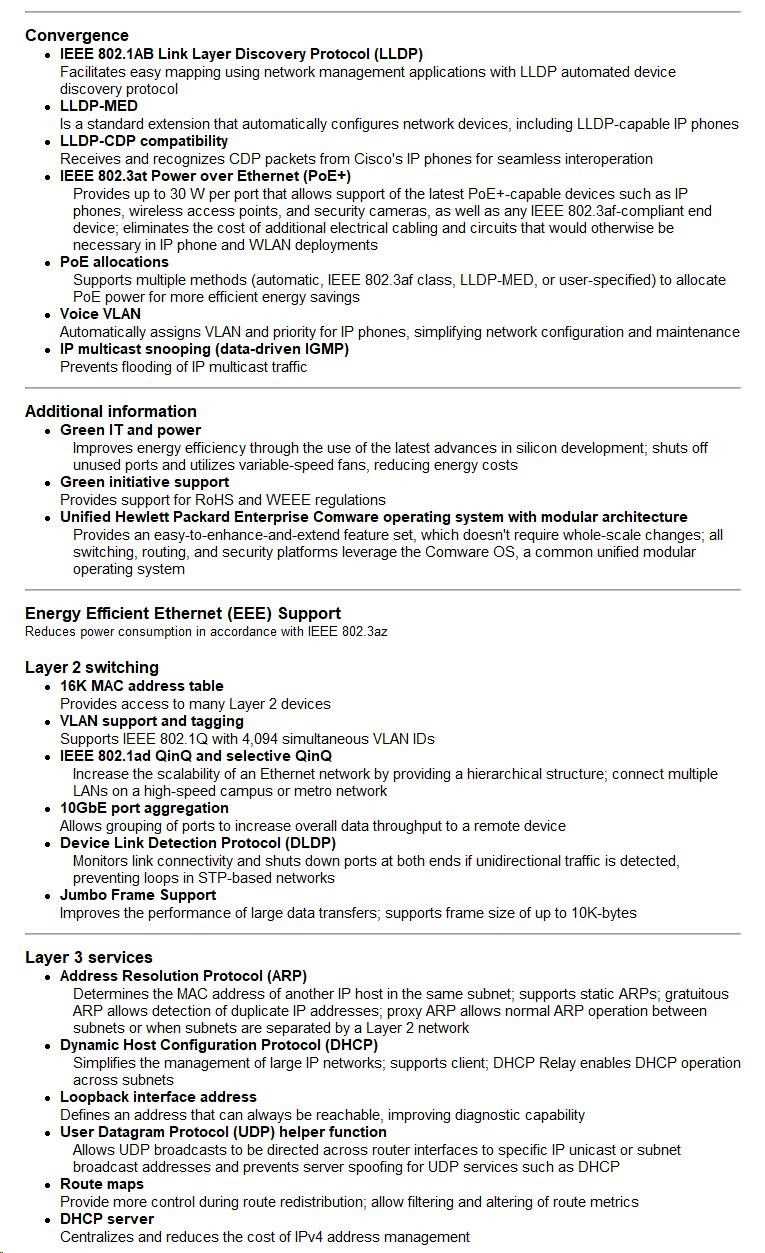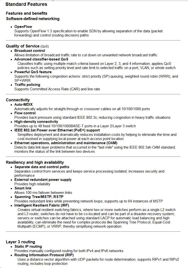 • Intelligent Resilient Fabric (IRF) Technology: Unifies multiple switches into one logical device, improving network resilience, performance, and availability while simplifying operations.