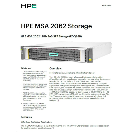 HPE MSA 2062 12Gb SAS SFF Storage Includes an MSA 2060-branded LFF or SFF array chassis depending on model, two MSA 2060 controllers, two 1.92TB Read Intensive SSDs, One Advanced Data Services LTU, two AC power supplies, two .7m PDU cords (IEC C14), one rack-mount kit..