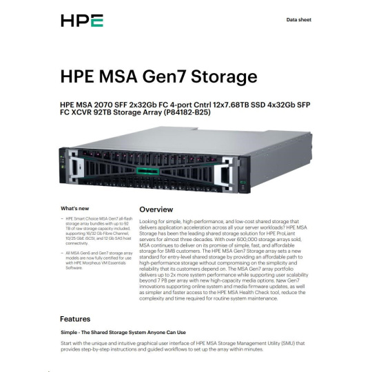 HPE MSA 2070 SFF 2x32Gb FC 4-port Controller 12x7.68TB SSD 4x32Gb SFP FC XCVR 92TB Storage Array Smart Choice.