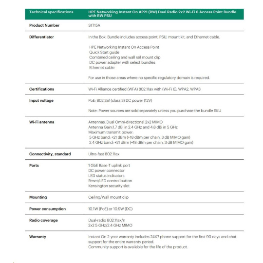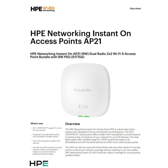 HPE Networking Instant On AP21 (RW) Dual Radio 2x2 Wi-Fi 6 Access Point Bundle with RW PSU