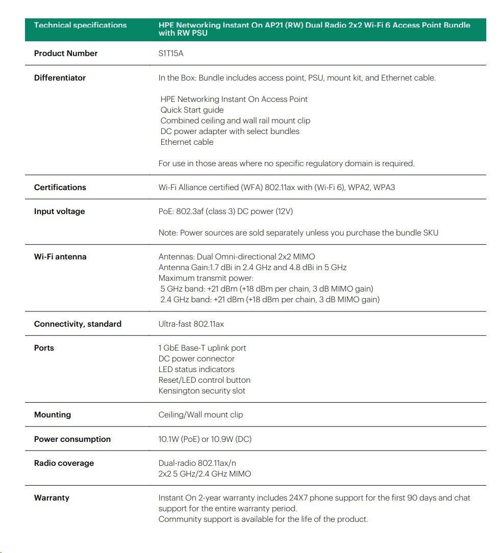 HPE Networking Instant On AP21 (RW) Dual Radio 2x2 Wi-Fi 6 Access Point Bundle with RW PSU.