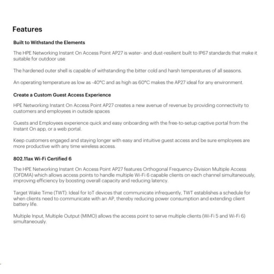 Take your business outdoors with the HPE Networking Instant On Access Points AP27. This fast outdoor Wi-Fi 6 AP is IP67 rated, keeping you connected through hot summers, frigid winters, rain, sleet, and snow. Able to withstand temperatures from temperatures from -40°F to 149°F, you can confidently connect up to 75 devices over Wi-Fi 6 to extend coverage to parking lots, outdoor workspaces, and hotel pools.