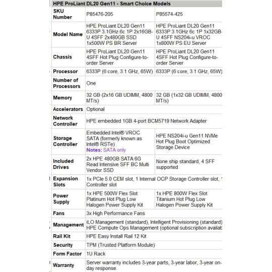 HPE PL DL20 gen11 6333P (3.1G/6C12T) 1x32G (P64339) 4SFF NS204i-u (2x480Gnvme) VROC 1x800W 4x1G NBD333 Smart Choice.