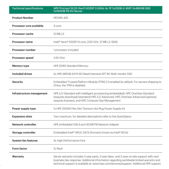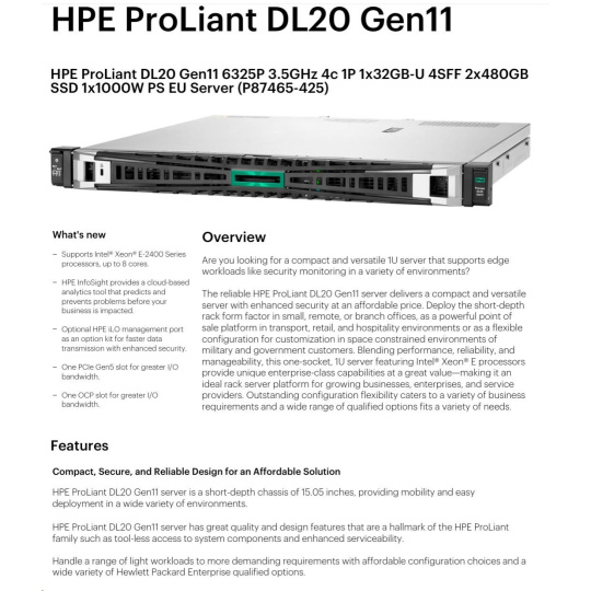 HPE PL DL20g11 6325P (3.5G/4C8T) 1x32G 2x480G SSD VROC 4SFF-HP 4p1Gb 1x1000W Smart Choice.