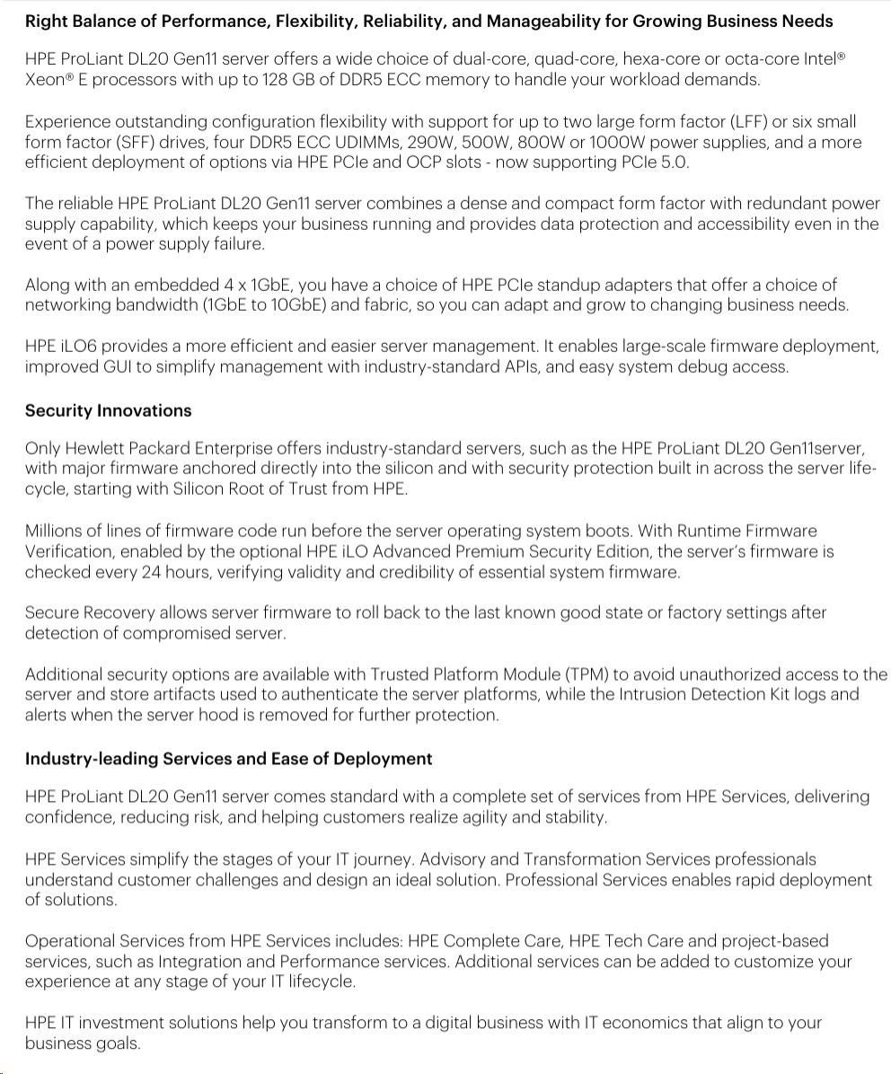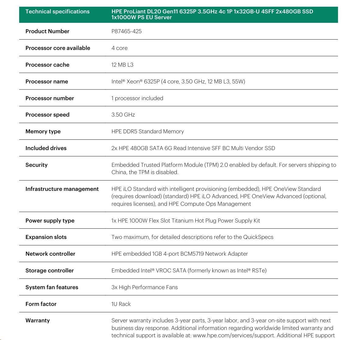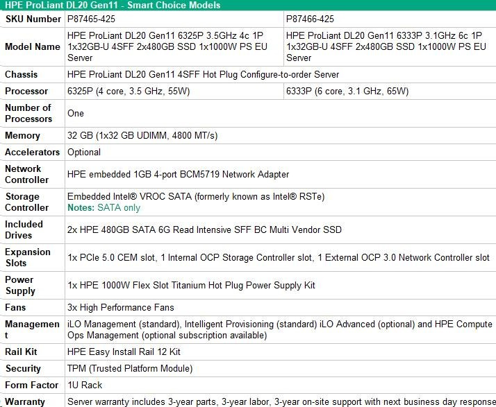 HPE PL DL20g11 6325P (3.5G/4C8T) 1x32G (P64339) 2x480G SSD VROC 4SFF-HP 4p1Gb 1x1000W Smart Choice
