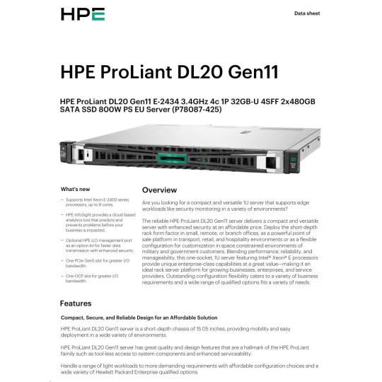HPE PL DL20g11 E-2434 (3.4G/4C) 1x32G (P64339) 2x480G VROC 4SFF 1x800W 4x1G NBD333 Smart Choice